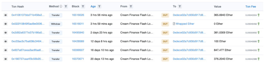 ตามข้อมูลจาก Glassnode บริษัทวิเคราะห์บล็อกเชน แอดเดรสที่ไม่ระบุชื่อ ซึ่งถูกระบุว่าเป็นผู้ไม่ประสงค์ดี ไดโจมตี CreamFinance โดยได้โอน 365.7 Ethereum ซึ่งมีมูลค่าประมาณ 600,000 ดอลลาร์สหรัฐไปยังแพลตฟอร์มคริปโตTradeOgre