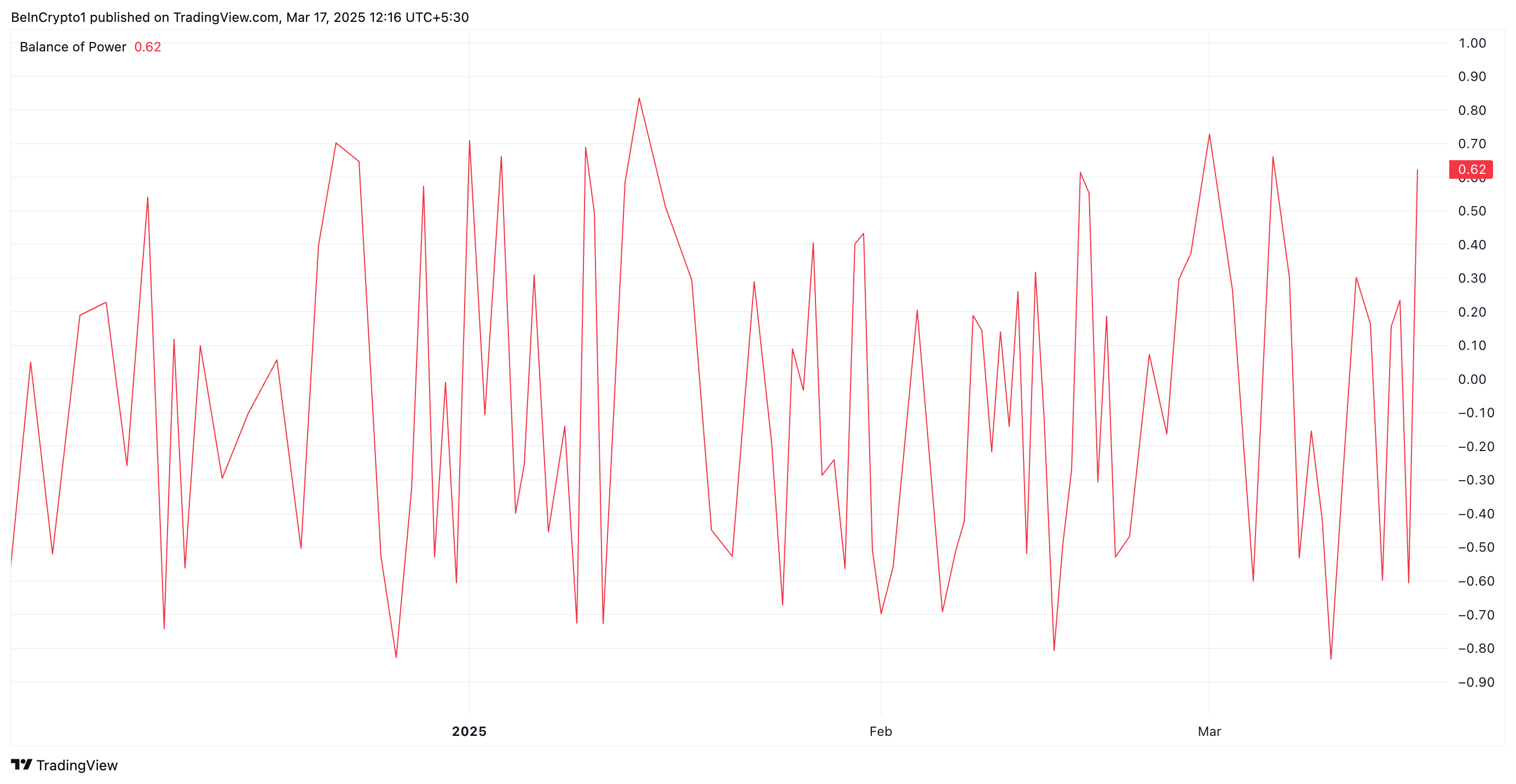 ตัวชี้วัด BoP วัดความแข็งแกร่งของผู้ซื้อเทียบกับผู้ขายในตลาดเพื่อระบุการเปลี่ยนแปลงของโมเมนตัม BoP ที่เป็นบวกเช่นนี้บ่งชี้ว่าแรงกดดันในการซื้อมีมากกว่าแรงกดดันในการขาย ซึ่งบ่งบอกถึงความต้องการที่เพิ่มขึ้นและ การเพิ่มขึ้นของราคา ที่เป็นไปได้