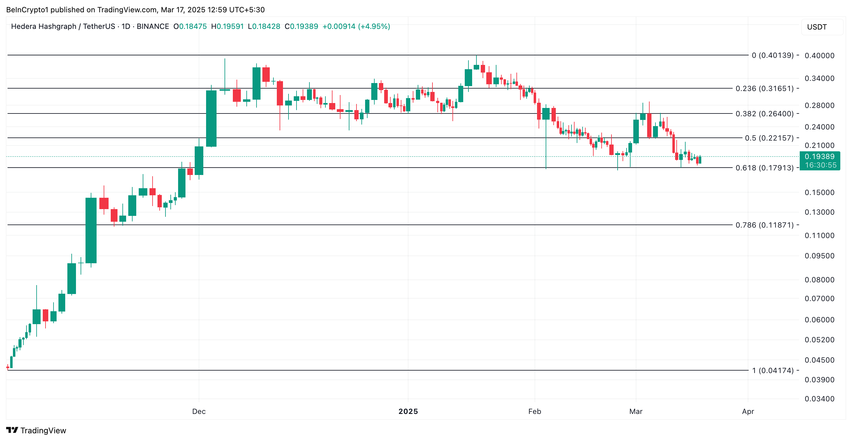 HBAR มีการซื้อขายที่ USD0.19 ในขณะนี้ โดยซื้อขายเหนือระดับแนวรับที่ USD0.17 เมื่อความต้องการเพิ่มขึ้น altcoin อาจพุ่งขึ้นสู่แนวต้านที่ USD0.22