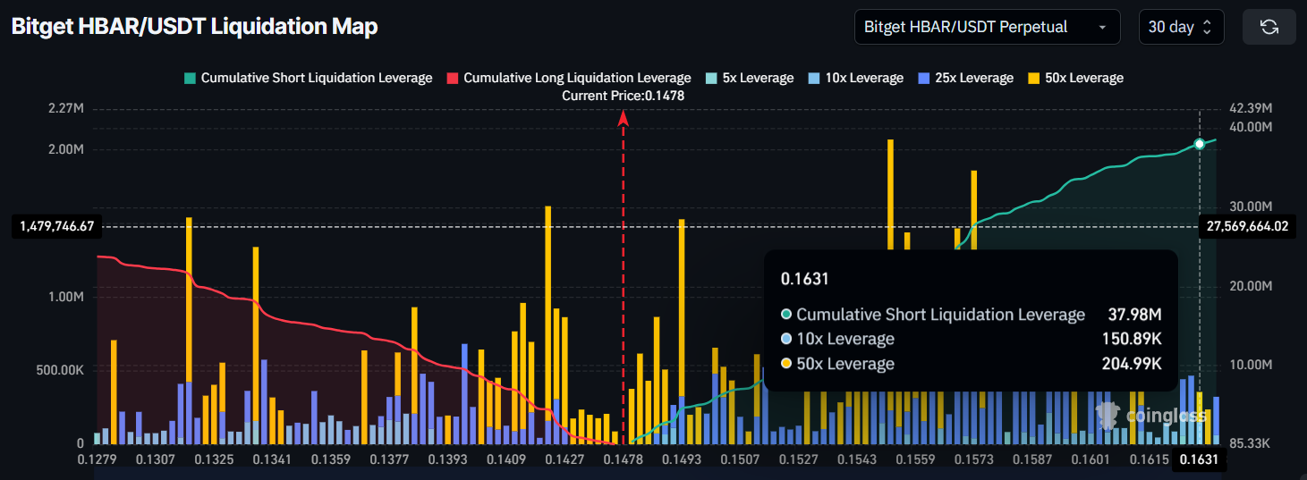 โมเมนตัมมหภาคสำหรับ HBAR เผยให้เห็น ว่านักเทรดขาลงอาจเผชิญกับการสูญเสียอย่างมากหากราคาสูงขึ้น แผนที่การชำระบัญชีระบุว่าสัญญาขาลงมูลค่าประมาณ 38 ล้าน USD อาจถูกชำระบัญชีหาก HBAR ทำลายแนวโน้มขาลงในปัจจุบันและเพิ่มขึ้นเป็น 0.163 USD