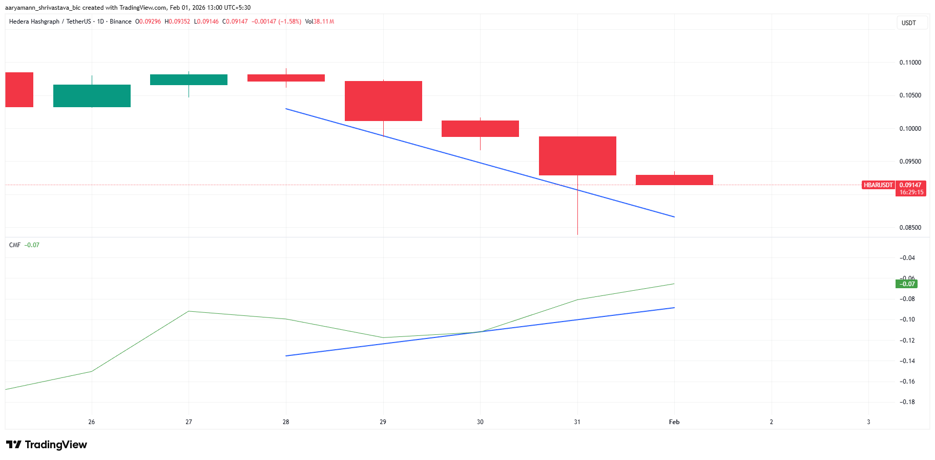 ราคาของ HBAR กำลังซื้อขายใกล้ 0.091 USD ในขณะที่เขียนบทความนี้ โดย altcoin ตัวนี้เคลื่อนไหวอยู่ในกรอบล่างที่ขยายกว้างออกมาเป็นเวลาประมาณหนึ่งเดือน โครงสร้างดังกล่าวเกิดขึ้นหลังจากความพยายามทะลุแนวต้านล้มเหลวในช่วงกลางเดือนมกราคม รูปแบบเหล่านี้มักจะสิ้นสุดด้วยการเคลื่อนไหวที่ชัดเจนทางใดทางหนึ่ง
