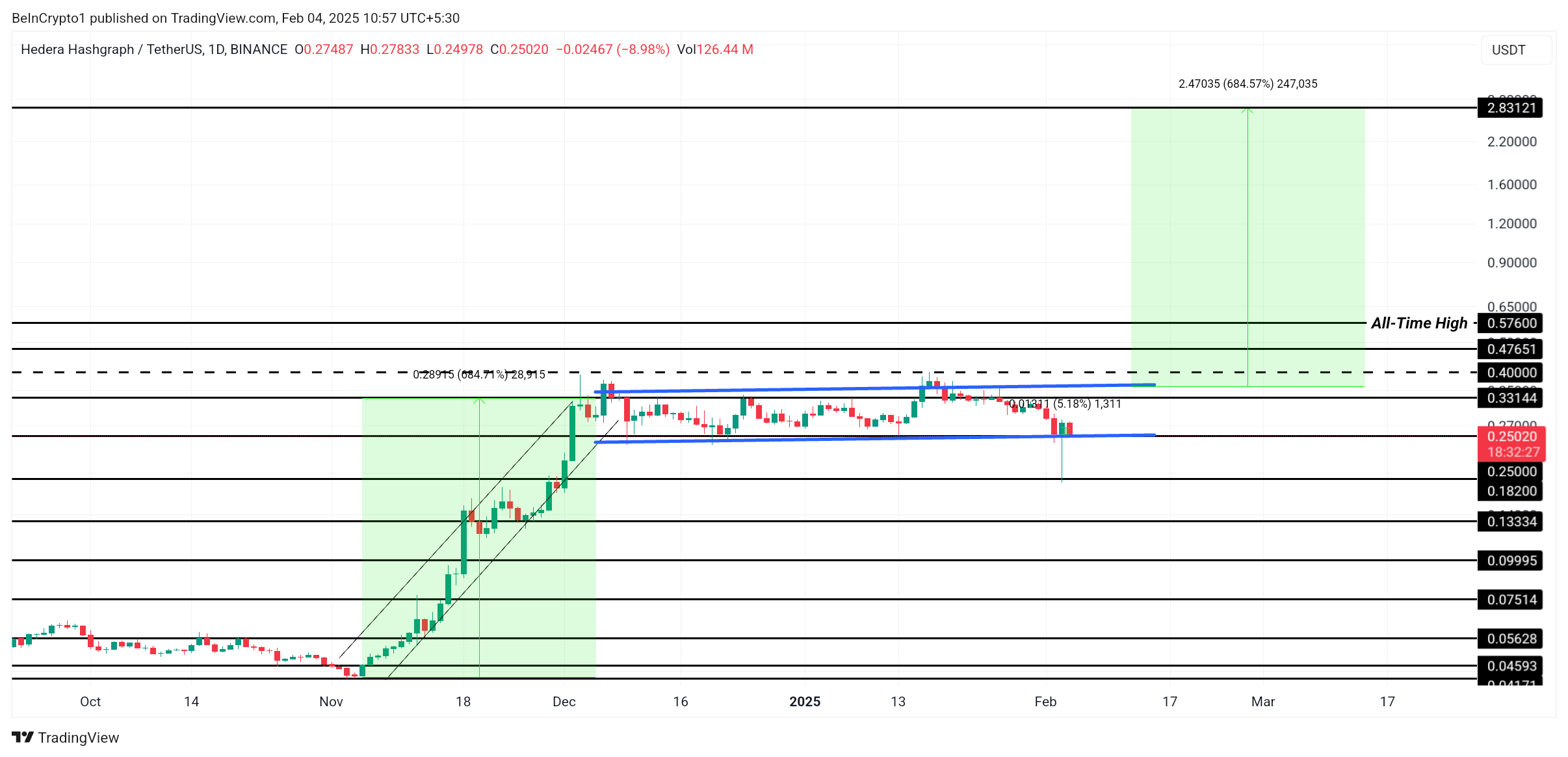 แม้จะมีแรงกดดันขาลงในระยะสั้น HBAR กำลังสร้าง รูปแบบธงกระทิงในภาพรวม ซึ่งในประวัติศาสตร์เป็นสัญญาณล่วงหน้าของการพุ่งขึ้นอย่างมาก หากรูปแบบนี้เกิดขึ้นจริง altcoin อาจพุ่งขึ้น 684% โดยมีเป้าหมายที่ 2.83 USD อย่างไรก็ตาม เพื่อให้การพุ่งขึ้นนี้เกิดขึ้น HBAR ต้องทะลุแนวต้านที่ 0.40 USD อย่างเด็ดขาด