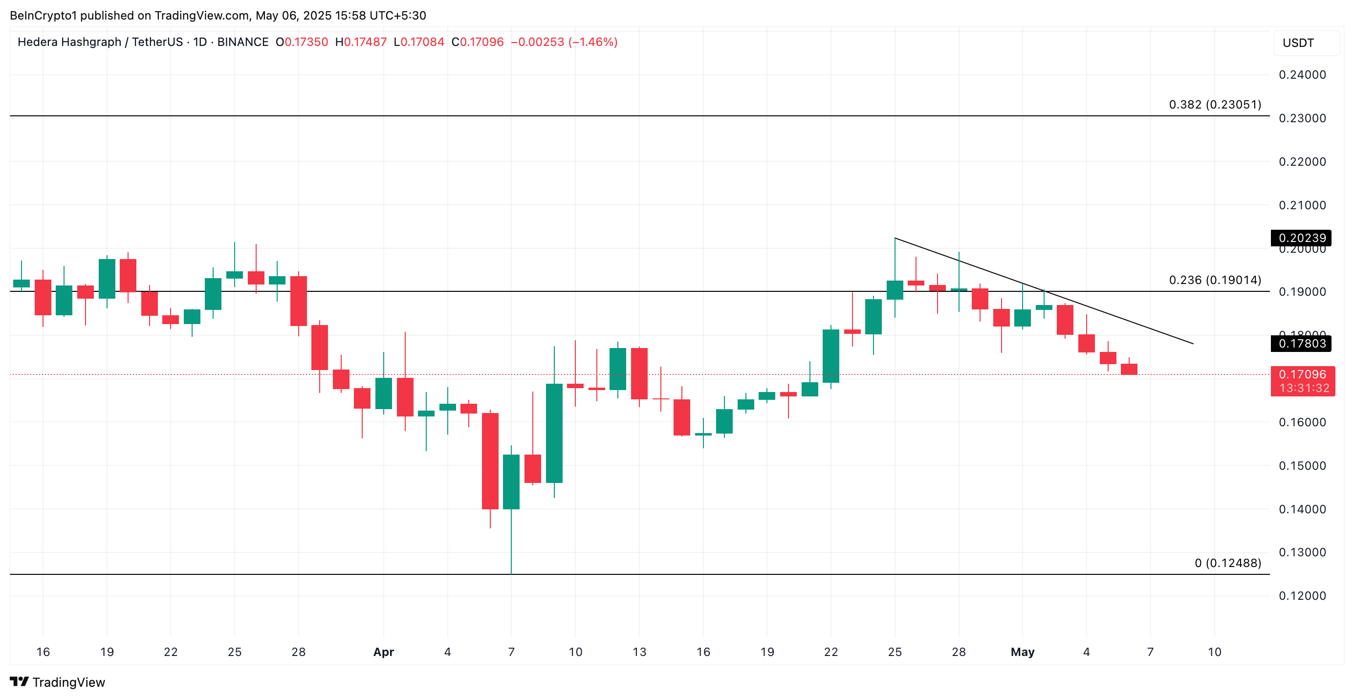 การลดลงของ HBAR ในช่วงวันที่ผ่านมาทำให้มันซื้อขายต่ำกว่าเส้นแนวโน้มขาลง นี่เป็นรูปแบบขาลงที่เกิดขึ้นเมื่อสินทรัพย์ทำจุดสูงสุดที่ต่ำลงอย่างต่อเนื่อง และจุดสูงสุดเหล่านั้นสามารถเชื่อมต่อด้วยเส้นตรงที่ลาดลง