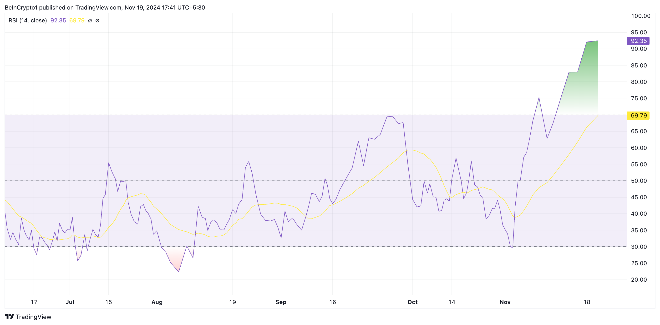 การอ่านค่าจาก ดัชนีความแข็งแกร่งสัมพัทธ์ RSI ของ HBAR ยืนยันว่าตลาดของมันร้อนเกินไป ณ เวลานี้ ตัวชี้วัดอยู่ที่ 92.35 ซึ่งเป็นจุดสูงสุดตลอดกาล