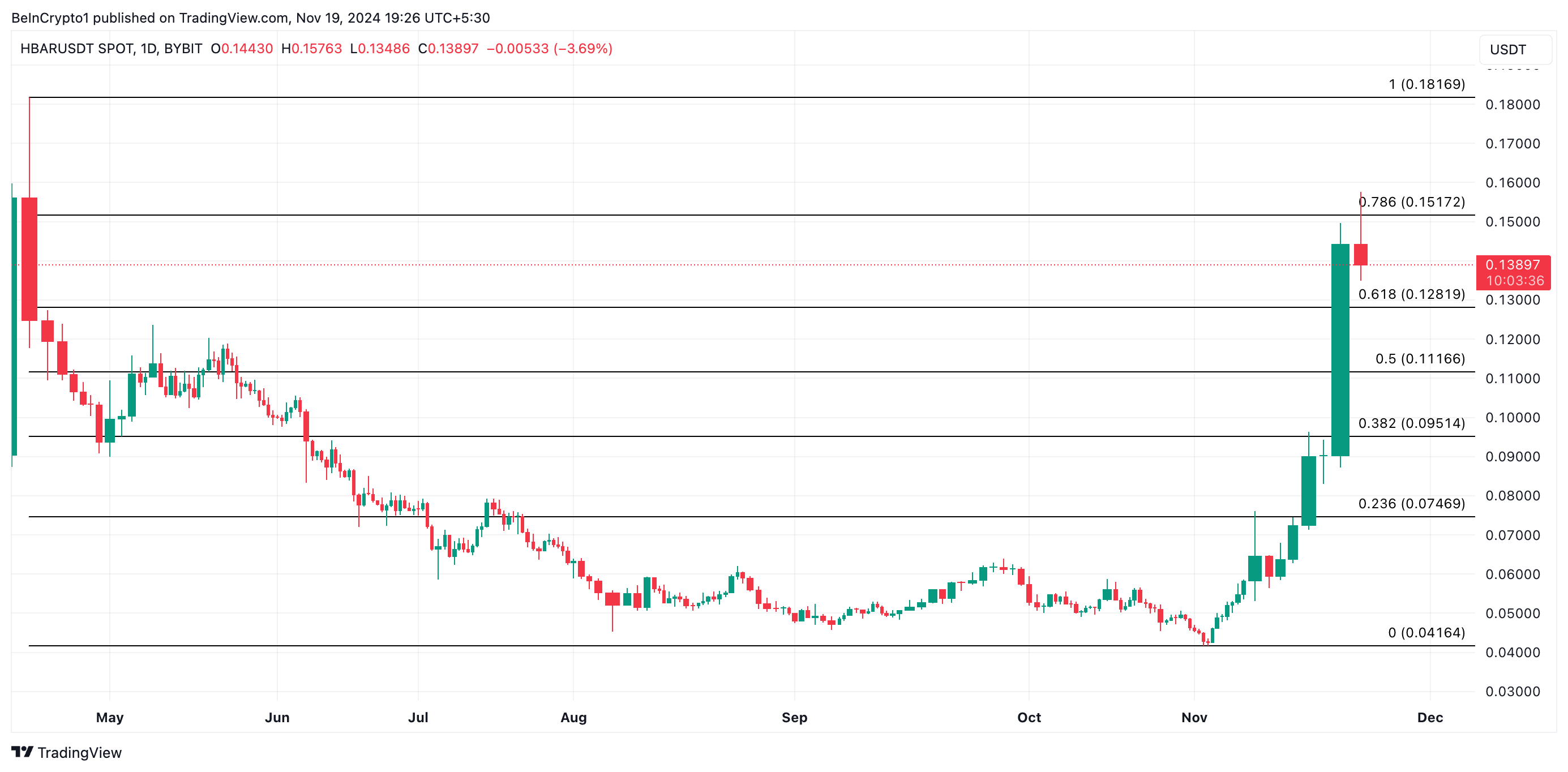 อย่างไรก็ตาม, หากแนวโน้มขาขึ้นยังคงดำเนินต่อไป Token HBAR จะกลับมาครองจุดสูงสุดของวัฏจักรที่ 0.15 ดอลลาร์ และพยายามที่จะผลักดันผ่านระดับนั้น ทำให้การคาดการณ์ที่เป็นแบบหมีไม่เป็นผล การทะลุผ่านระดับนี้อย่างสำเร็จจะนำ HBAR ไปสู่การซื้อขายที่ระดับสูงสุดในปีนี้ที่ 0.18 ดอลลาร์