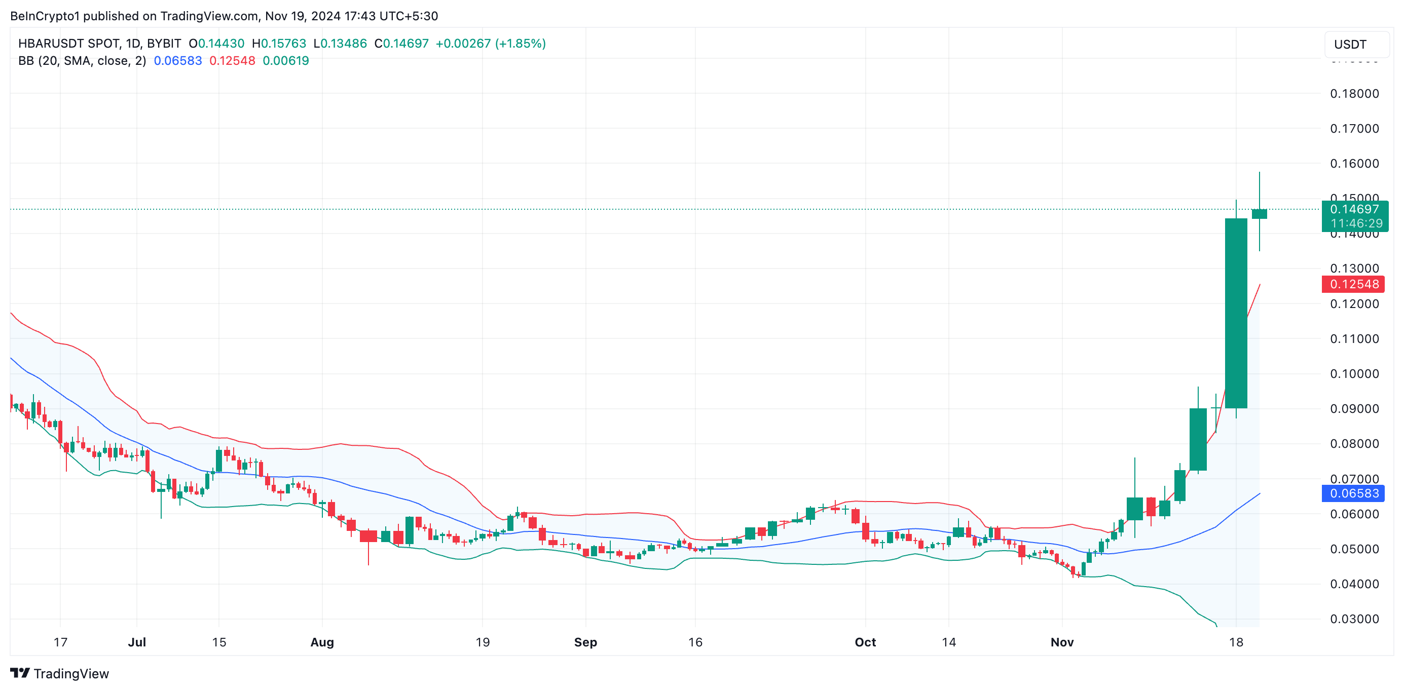 นอกจากนี้ ราคาของ HBAR ยังทะลุผ่านแถบบนของตัวชี้วัด Bollinger Bands ซึ่งยืนยันว่ามันถูกซื้อมากเกินไปในหมู่ผู้เข้าร่วมตลาด