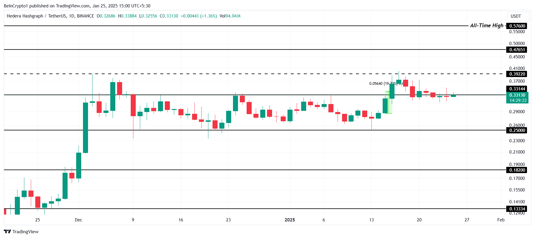 ปัจจุบัน HBAR ซื้อขายที่ 0.33 USD โดยมุ่งหวังที่จะสร้างระดับนี้เป็นฐานสนับสนุน การทำเช่นนี้สำเร็จเป็นสิ่งสำคัญสำหรับโทเค็นในการท้าทายระดับแนวต้านที่ 0.39 USD การทะลุเหนือแนวต้านนี้อาจเป็นการเปิดทางสำหรับการเคลื่อนไหวขึ้นต่อไป