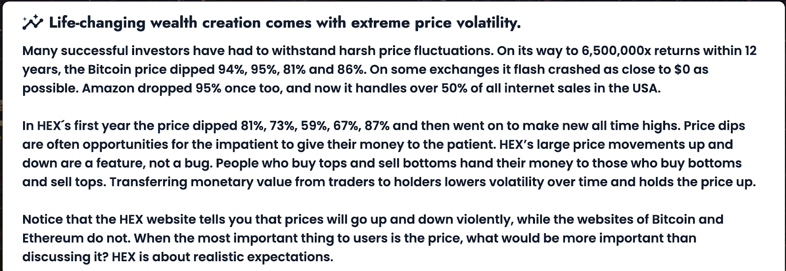 ข้อความที่ระบุบนเว็บไซต์อ้างว่า นักลงทุนจะสร้าง “ความร่ำรวยที่จะเปลี่ยนแปลงชีวิต” ของพวกเขาได้ โปรเจกต์ที่มีผลิตภัณฑ์ที่แข็งแกร่งมักจะไม่ได้โฟกัสไปที่การเพิ่มราคาในตลาดเป็นหลักเพื่อวัตถุประสงค์ทางการตลาด เว็บไซต์ของ Bitcoin และ Ethereum นั้นไม่ได้พูดถึงความผันผวนของราคาหรือการสร้าง “ความร่ำรวยที่จะเปลี่ยนแปลงชีวิต” เพราะพวกมันมีวัตถุประสงค์อื่นๆ นักลงทุนที่ได้รับกำไรนั้นเป็นผลพลอยได้จากวัตถุประสงค์ที่เพิ่มมากขึ้นของโปรเจกต์เหล่านี้