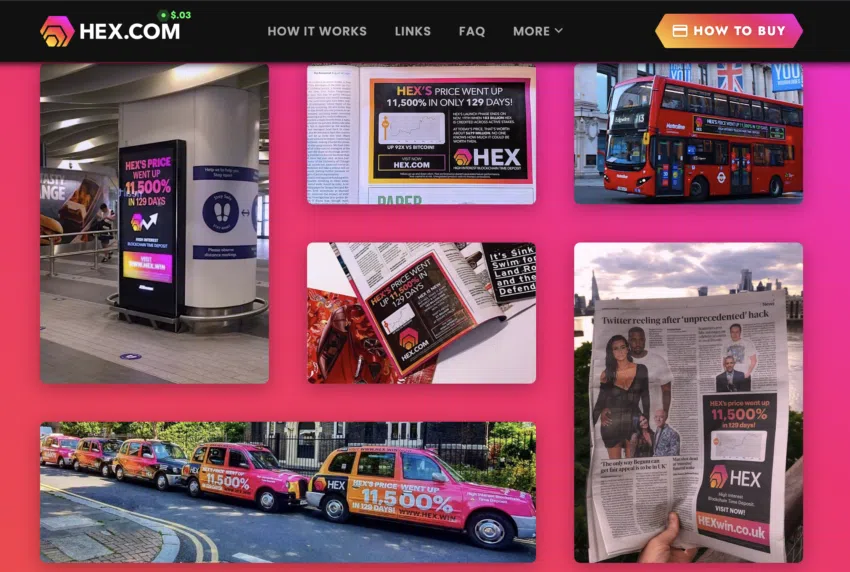 มันเป็นหนึ่งในโปรเจกต์ Crypto ที่ทำการตลาดได้อย่างดุเดือดที่สุด โปรเจกต์นี้ได้ลงโฆษณาในหนังสือพิมพ์ นิตยสาร ป้ายโฆษณา และในสนามบิน แคมเปญทั้งหมดเหล่านี้โฟกัสไปที่การแสดงให้เห็นว่าราคาของโทเค็นเพิ่มขึ้นมากเท่าใด แนวทางนี้เหมือนกับโปรเจกต์รวยทันใจที่ทำเพื่อตอบสนองความโลภของคนทั่วไป ผู้ใช้งาน Twitter โพสต์ว่า HEX ใช้รายชื่อบัญชีแยกประเภทของลูกค้าที่ถูกแฮ็กมาและส่งเมล์การตลาดไปยังที่อยู่ที่ได้รับจากมาจากวิธีการดังกล่าว จะมีโปรเจกต์ Web3 ซักกี่โปรเจกต์ที่ทำการตลาดได้ทัดเทียมกับ HEX?