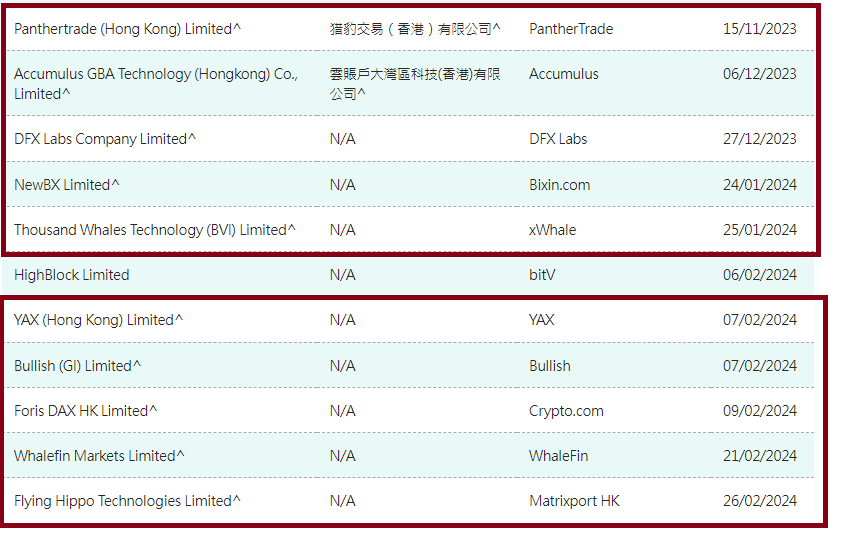 ตามเว็บไซต์ SFC ผู้สมัคร 11 คน รวมถึง Matrixport HK Accumulus Crypto.com และ Bullish ถือว่าได้รับอนุญาตแพลตฟอร์มอื่นๆ ในรายการ ได้แก่ HKbitEX PantherTrade DFX Labs Bixincom xWhale YAX และ WhaleFin