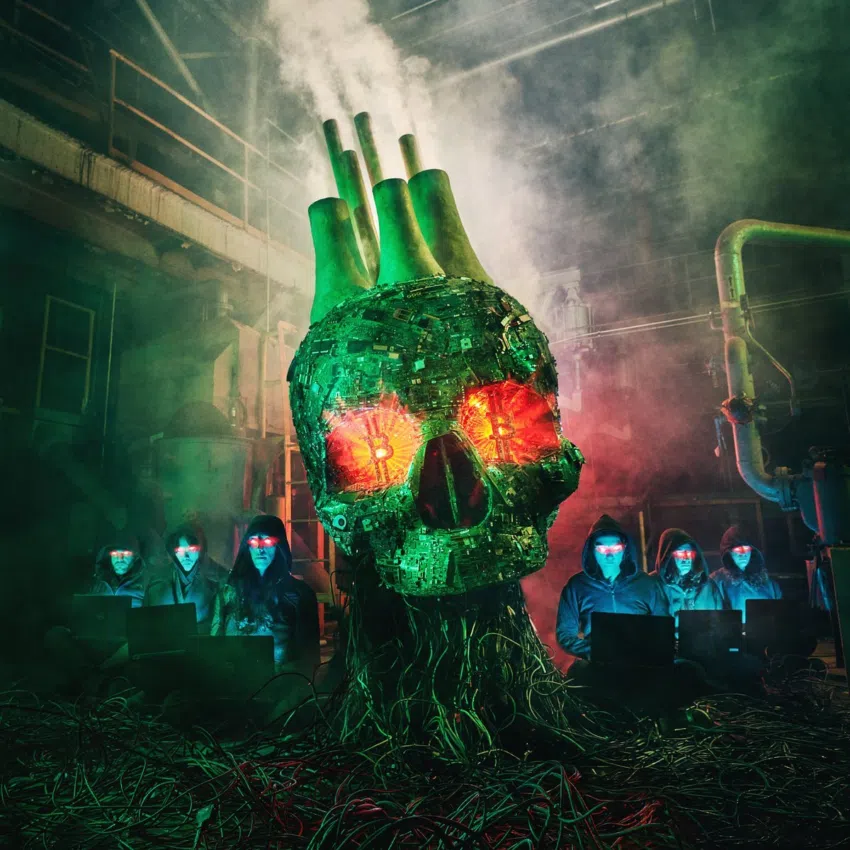 กะโหลกศีรษะทำจากขยะอิเล็กทรอนิกส์รีไซเคิล ประดับด้วย “กองบุหรี่” เพื่อเป็นสัญลักษณ์ของ “เชื้อเพลิงฟอสซิลและมลพิษจากถ่านหิน” ที่เกิดจากการขุด Bitcoin และ “คอมพิวเตอร์หลายล้านเครื่อง” ที่ใช้ในการตรวจสอบธุรกรรมเครือข่าย