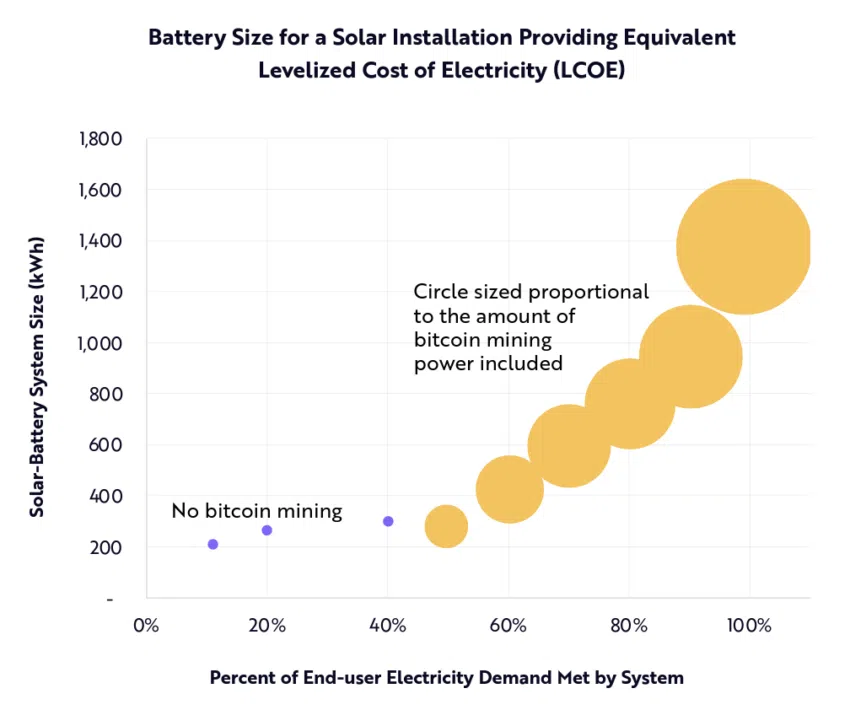 การวิจัยของ ARK ชี้ให้เห็นว่าการขยายความจุแบตเตอรี่ของระบบสุริยะขึ้น 4.6 เท่า และการรวมการดำเนินการขุด Bitcoin สามารถตอบสนองความต้องการของผู้บริโภคได้มากกว่า 99% ในขณะที่ยังคงรักษาความสามารถในการทำกำไร