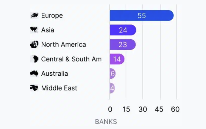 การศึกษาจาก Coincub ระบุว่ามีธนาคารในยุโรปถึง 55 แห่งที่ได้รวมบริการที่เกี่ยวข้องกับคริปโตเคอร์เรนซี เยอรมนีมีธนาคาร 6 แห่ง ขณะที่สหราชอาณาจักรมี 5 แห่ง ประเทศอย่างสวิตเซอร์แลนด์ ลิกเตนสไตน์ และลิทัวเนียก็มีธนาคารที่เป็นผู้นำในด้านนี้เช่นกัน