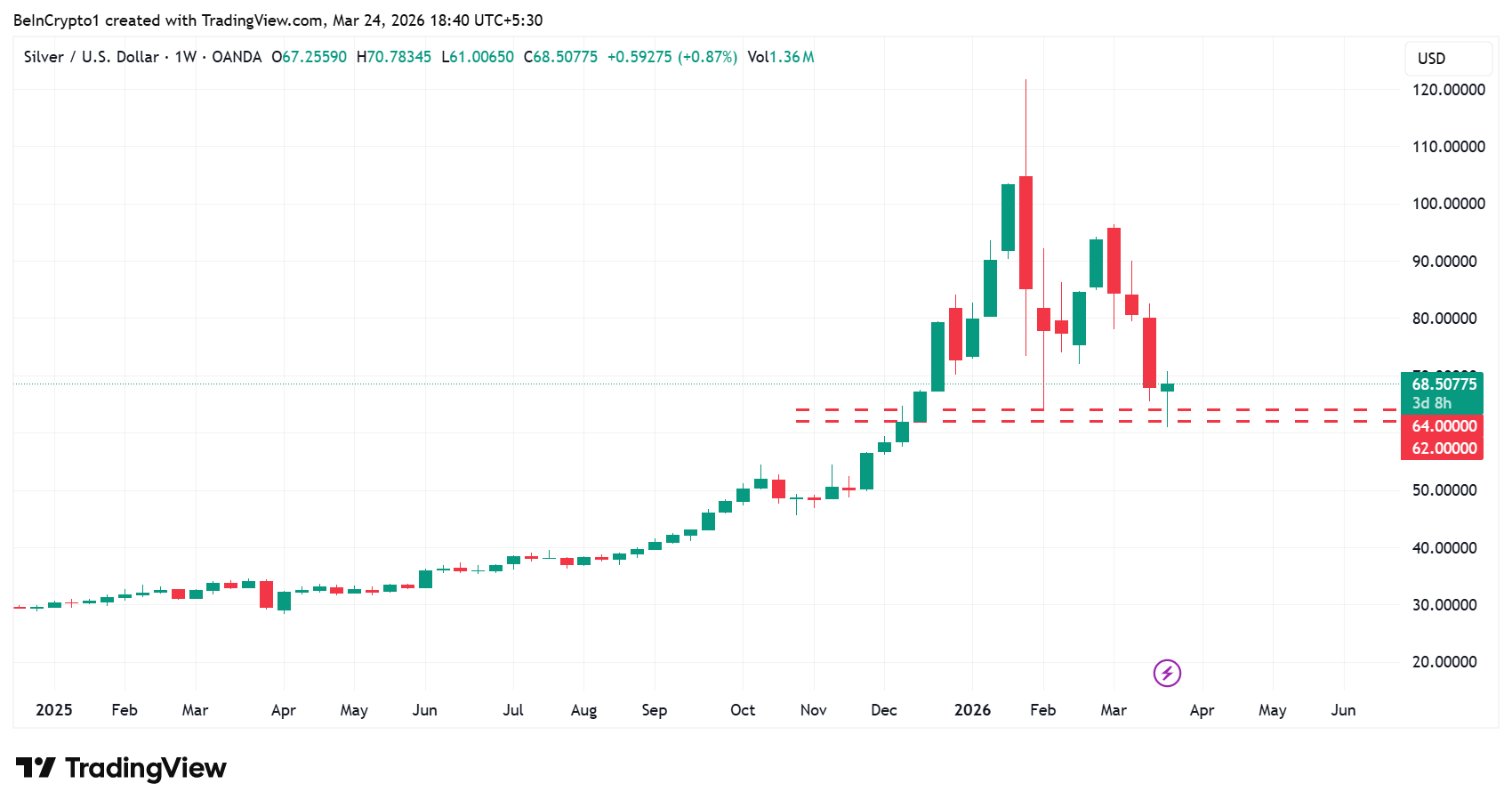 ปัจจัยที่อยู่เบื้องหลัง การร่วงลงของราคาซิลเวอร์ นั้นเหมือนกับทองคำทุกประการ โดยปัจจัยสำคัญคือประเด็นอัตราดอกเบี้ยของเฟด สำหรับตอนนี้ แนวรับสำคัญอยู่ที่ USD62–64 ต่อออนซ์
