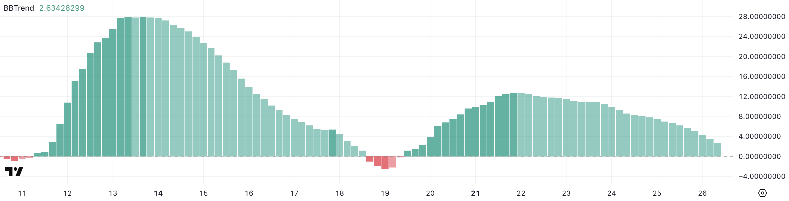 Hyperliquid กำลังเห็นการลดลงอย่างรวดเร็ว ในตัวชี้วัด BBTrend ซึ่งขณะนี้อยู่ที่ 2.63 ลดลงจาก 12.68 เมื่อห้าวันก่อน การลดลงอย่างรวดเร็วนี้แสดงให้เห็นว่าโมเมนตัมขาขึ้นที่เห็นก่อนหน้านี้ได้จางหายไปอย่างรวดเร็ว
