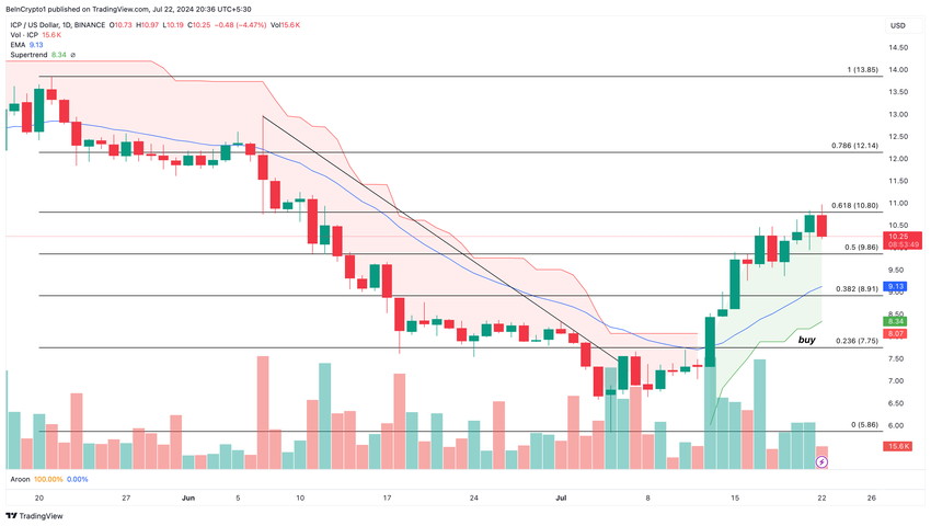 ICP เพิ่มขึ้นเหนือแนวโน้มขาลงใน วันที่ 6 กรกฎาคม ซึ่งมีความสําคัญต่อการพุ่งขึ้นเมื่อเร็วๆ นี้ แม้ว่าโทเค็นจะซื้อขายที่ 10.25 ดอลลาร์ แต่ก็ยังคงอยู่เหนือ 20 EMA สีน้ำเงิน ซึ่งอยู่ที่ 9.13 ดอลลาร์