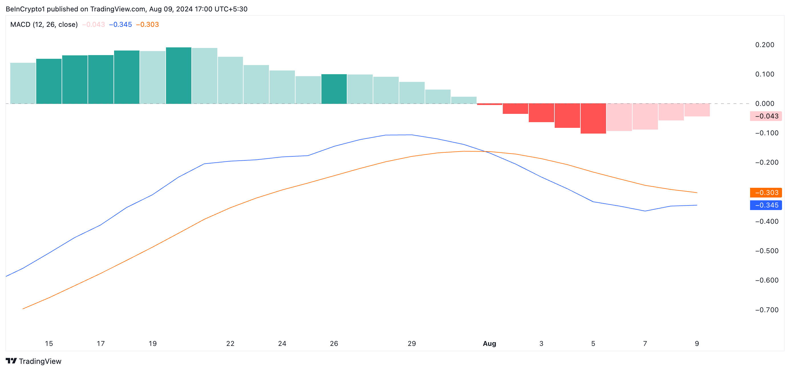 ตัวบ่งชี้ Moving Average Convergence/Divergence (MACD) แสดงให้เห็นว่าอคติขาลงยังคงแข็งแกร่งแม้จะมีการชุมนุมก็ตาม เส้น MACD ของ IO (สีน้ําเงิน) ปัจจุบันอยู่ต่ํากว่าทั้งเส้นสัญญาณ (สีส้ม) และเส้นศูนย์