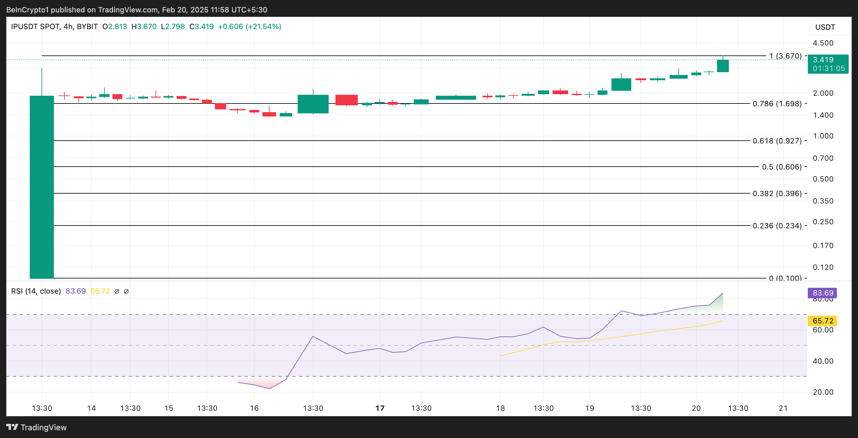 ที่ 83.69 RSI ของ IP บ่งบอกถึงการปรับตัวในระยะใกล้ หากเกิดขึ้น ราคาของ altcoin อาจลดลงไปที่ 1.69 USD