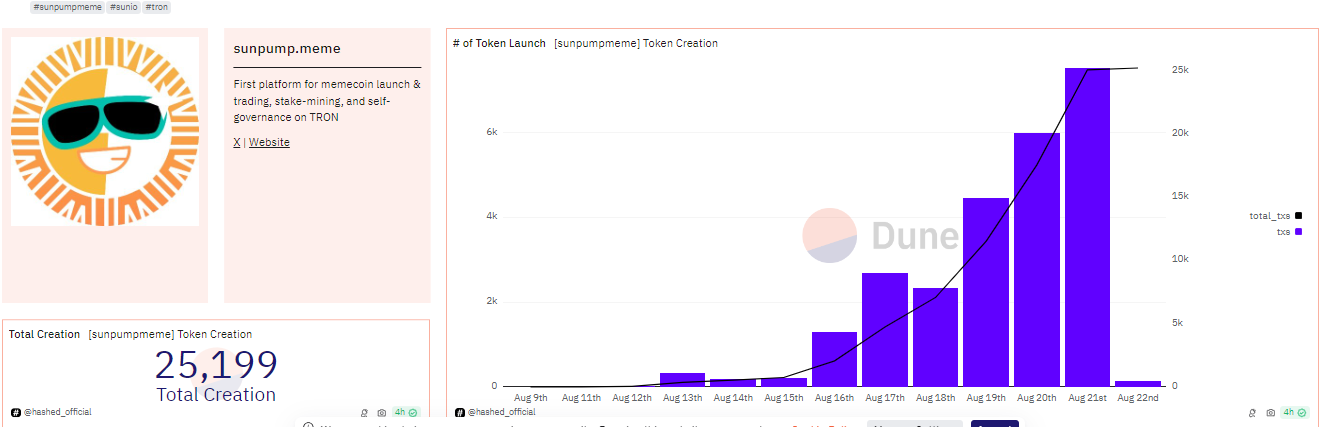 เนื่องจากสภาพคล่องที่กว้างขวางของ TRON Sun คาดว่านักพัฒนาและผู้ค้ากระตือรือร้นที่จะลงทุนในเหรียญมีมใหม่และมีแนวโน้ม การทําธุรกรรมที่รวดเร็วและต้นทุนต่ําของบล็อกเชนช่วยเพิ่มความน่าสนใจยิ่งขึ้น จากข้อมูลของ Dune Analytics มีการสร้างโทเค็นเกือบ 25,200 โทเค็นบนแพลตฟอร์ม SunPump ของ TRON จนถึงปัจจุบัน