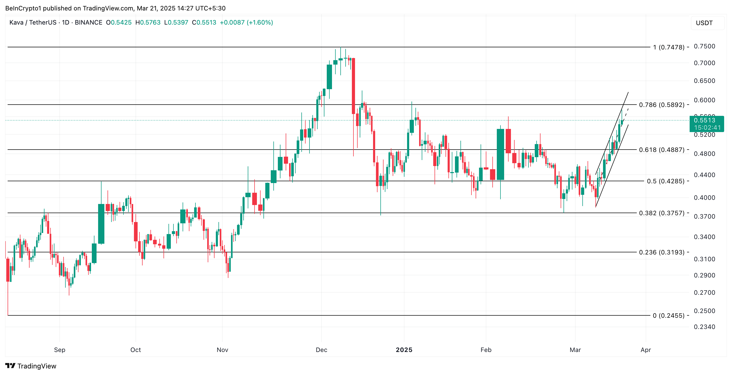 KAVA ได้ซื้อขายภายในช่องคู่ขนานที่เพิ่มขึ้นตั้งแต่วันที่ 10 มีนาคม รูปแบบขาขึ้นนี้เกิดขึ้นเมื่อราคาของสินทรัพย์เคลื่อนที่ระหว่างเส้นแนวโน้มคู่ขนานที่ลาดขึ้นสองเส้น ซึ่งบ่งชี้ถึงแนวโน้มขาขึ้นที่ยั่งยืน
