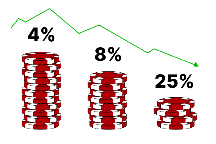 สูตรนี้มันมีค่ามหาศาล ด้วยการนับไพ่แบล็คแจ็ค การเดิมพัน 4% ของมูลค่าสุทธิของคุณในแต่ละรอบจะส่งผลให้เกิดผลกำไรระยะยาวสูงสุด ในขณะที่การเดิมพัน 8% นั้นแย่ลงอย่างเห็นได้ชัด และการเดิมพัน 25% ส่งผลให้เกิดการขาดทุน บล็อกโพสต์นี้โดย Nicholas Yoder ผู้จัดการพอร์ตโฟลิโออาวุโสของ Virgil Quantitative Research ให้การแสดงภาพที่ยอดเยี่ยมและอธิบายเหตุผลง่ายๆ: การชนะแล้วสูญเสียเปอร์เซ็นต์ของมูลค่าสุทธิของคุณเท่าเดิม จะส่งผลให้ขาดทุนสุทธิเสมอ