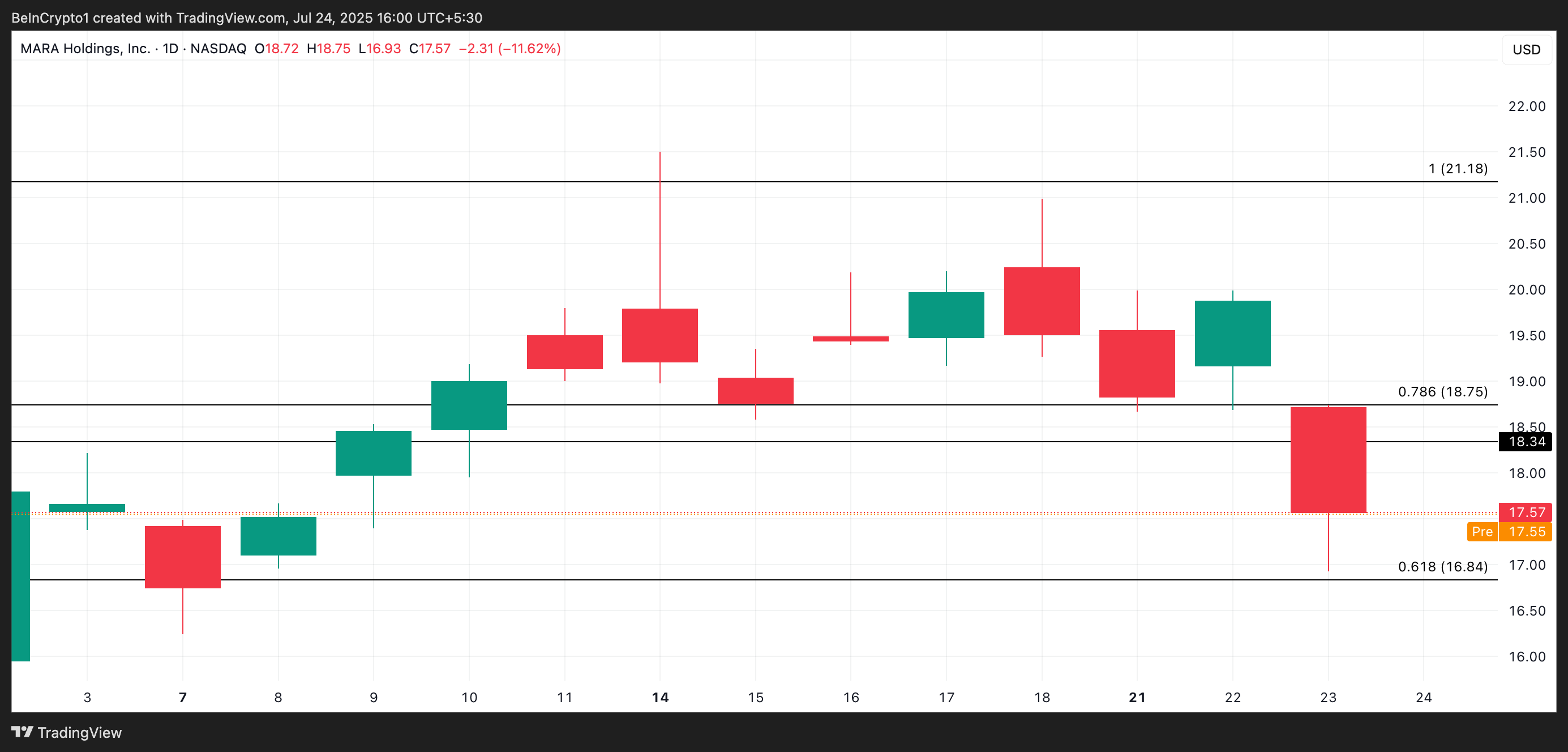 แม้ว่าจะมีการลดลงอย่างมาก แต่ MARA ซื้อขายสูงขึ้นเล็กน้อยในช่วงก่อนตลาดวันนี้ที่ 17.55 USD หากความสนใจในการซื้อเพิ่มขึ้นเมื่อเปิดตลาด หุ้น MARA อาจพุ่งขึ้นไปที่แนวต้านที่ 18.34 USD