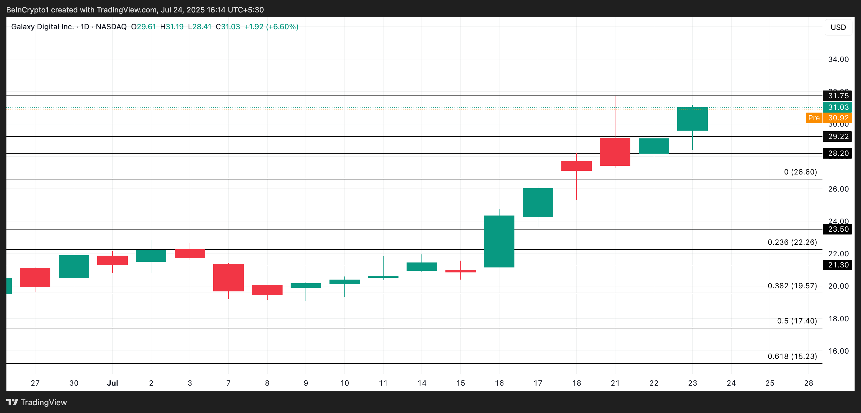 หุ้น Galaxy Digital พุ่งขึ้น 7% ในวันพุธ ปิดที่ 31.03 USD ซึ่งเกิดขึ้นหลังจากการประกาศความร่วมมือใหม่กับ K Wave Media ในวันจันทร์