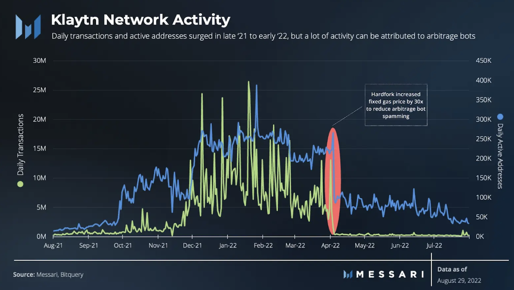 เช่นเดียวกับ L1s อื่น ๆ กิจกรรมเครือข่าย Klaytn เริ่มเติบโตขึ้นอย่างมีนัยยะในช่วงครึ่งหลังของปี 2021 เนื่องจากค่าธรรมเนียมก๊าซ Ethereum ที่สูงทำให้ผู้ใช้ไปย้ายที่อื่น ธุรกรรมรายวันของโปรโตคอลพุ่งสูงขึ้นตั้งแต่ต้นไตรมาสที่ 4 ปี 21 ถึงสิ้นไตรมาสที่ 1 ปี 22 เป็นพิเศษเมื่อเทียบกับบล็อกเชนอื่นๆ