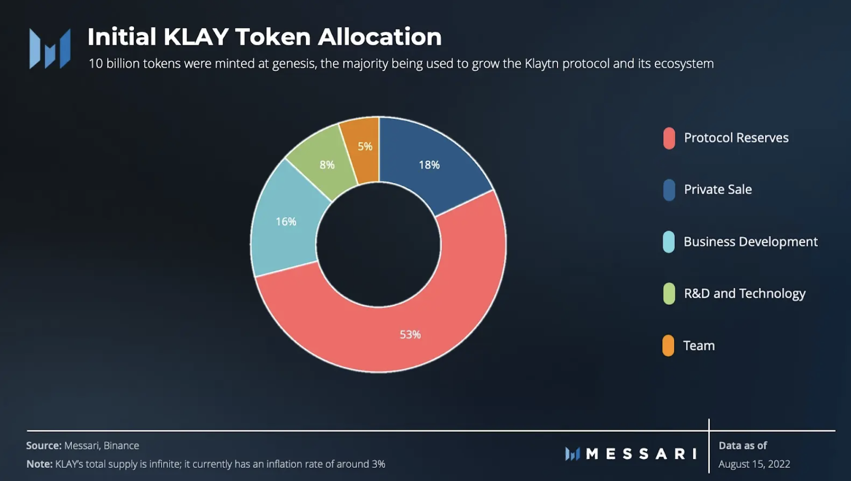 อ้างอิงข้อมูลจาก Messari การกระจายของ KLAY ค่อนข้างยุติธรรม โดยโทเค็นส่วนใหญ่ถูกใช้เพื่อส่งเสริมการเติบโตของโปรโตคอล การจัดสรรให้กับทีม/บริษัทโปรโตคอลและ VCs (23%) นั้นต่ำกว่า alt-L1 อื่นๆ อย่างมาก เช่น Solana (48%), Avalanche (42%), Algorand (39%), Binance Smart Chain (50%) และ NEAR (38%)