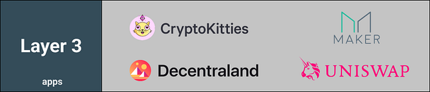Layer 3 คือ Dapp หรือแอฟพริเคชั่นที่เราใช้กันอยู่ในปัจจุบัน ซึ่งมี UI อยู่หลากหลายและง่ายต่อผู้ใช้งาน