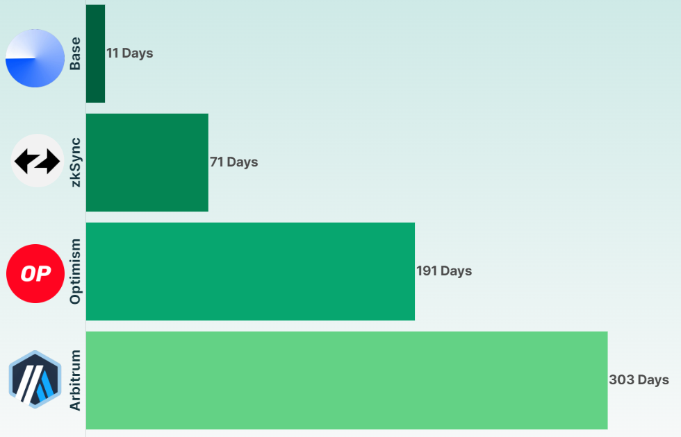 ตัวอย่างเช่น Base บรรลุเป้าหมายสำคัญในเวลาเพียง 11 วัน แต่เมื่อ Optimism เปิดตัวในเดือนมกราคม 2021 แพลตฟอร์มดังกล่าวใช้เวลา 191 วันในการบรรลุเป้าหมาย ในขณะที่ Arbitrum ซึ่งเริ่มดำเนินการในเดือนกันยายนปีนั้นใช้เวลานานกว่านั้นคือ 303 วัน