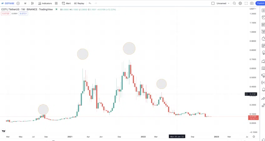 เมื่อได้รับการลิสต์แล้ว COTI ทำระดับสูงสุดจากระดับที่ได้ถูกลิสต์ จากนั้น มันก็สร้างจุดสูงสุดอีกจุดหนึ่ง ตามด้วยจุดสูงสุดที่ต่ำลง