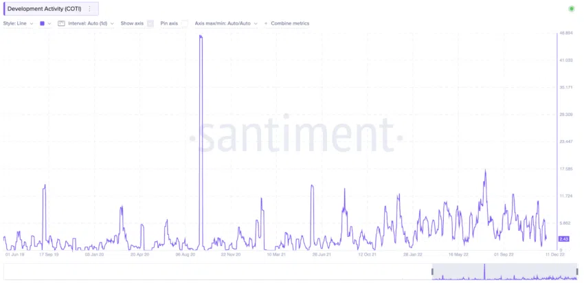 ตั้งแต่เดือนมิถุนายนถึงเดือนธันวาคม 2022 กิจกรรมการพัฒนาของ COTI นั้นค่อนข้างคงที่ ยกเว้นจุดสูงสุดในช่วงกลางเดือนกันยายน