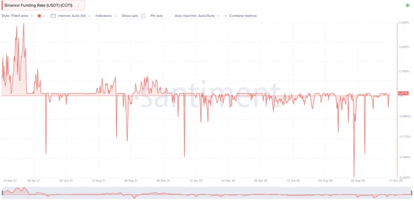 คู่ COTI-USDT บน Binance นั้นโดดเด่นที่สุด หากเราดูที่ Funding Rate มันต่ำอย่างเห็นได้ชัดตั้งแต่เดือนเมษายน 2022 Funding Rate ที่ติดลบนั้นแสดงให้เห็นว่าเหล่านักเทรดกำลังเดิมพันให้ราคาของ COTI ลดลง นี่อาจจะไม่ใช่ตัวชี้วัดที่ดีนัก