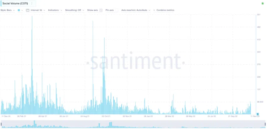 ปริมาณโซเชียลสำหรับ COTI ในปี 2022 นั้นค่อนข้างต่ำ ดูเหมือนว่าจะไม่มีอะไรที่สำคัญเกิดขึ้น