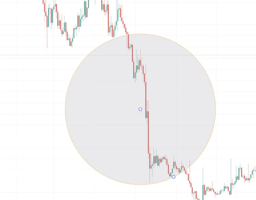 ตอนนี้เรามีจุดสูงสุดที่ 0.00781 ดอลลาร์ (เรากำหนดมันให้เป็นจุด F) เราสามารถวางจุดราคาจากจุดสูงสุดไปหาจุดต่ำสุดเพื่อหาจุดต่ำสุดถัดไปได้ สิ่งนี้จะช่วยให้เราระบุแนวโน้มราคาของ CKB ที่อาจจะเกิดขึ้นได้เมื่อตลาดหมีคลายตัว