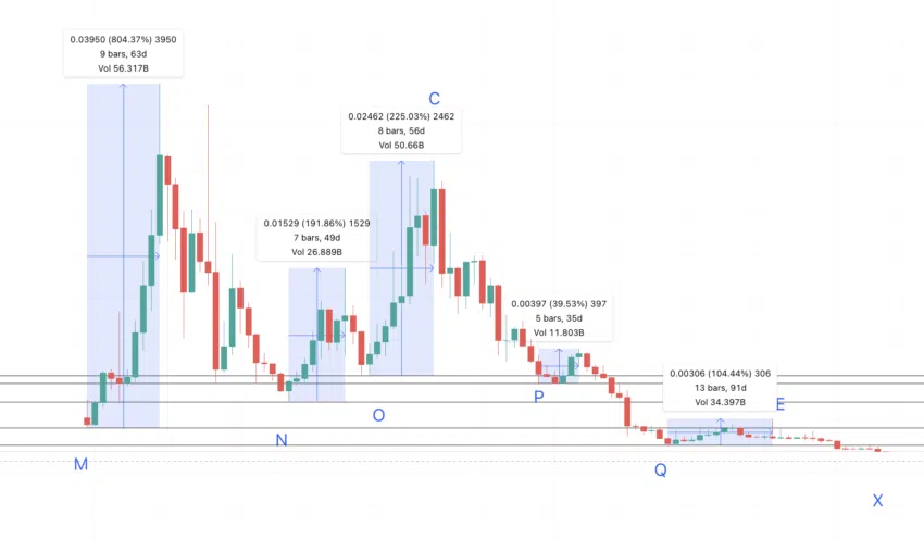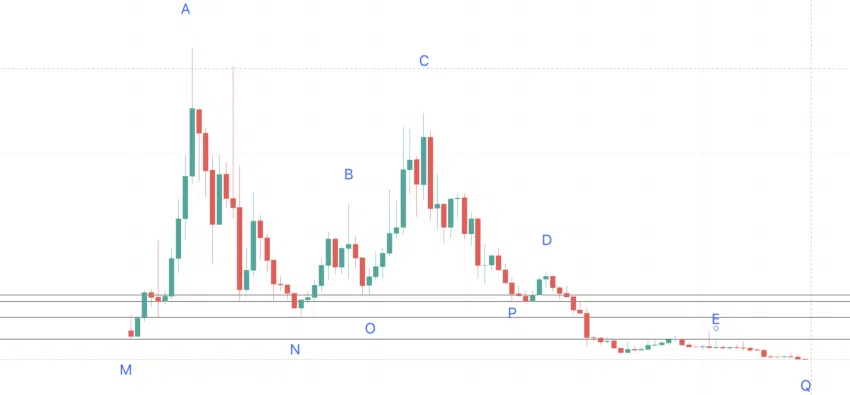 ในการวางจุดราคาจากจุด X (สมมติว่าเป็นค่าต่ำสุดในปัจจุบัน) เราจะได้ค่าสูงสุดถัดไปที่ 0.00781 ดอลลาร์ นี่เป็นเหตุผลที่สอดคล้องกับจุด N ซึ่งเป็นหนึ่งในจุดต่ำสุดที่สูงขึ้นจากรูปแบบเก่า ซึ่งหมายความว่ามันมีแนวต้านที่แข็งแกร่งที่จุดนี้