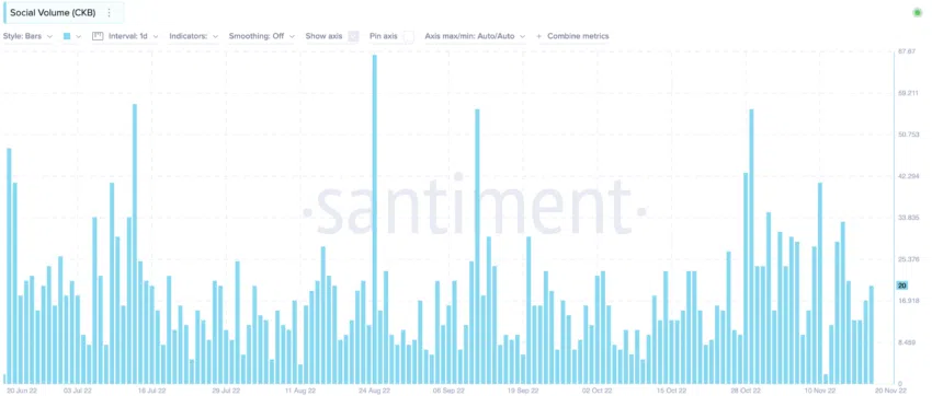 ปริมาณทางสังคมที่เกี่ยวข้องกับ Nervos Network เพิ่มขึ้นในเดือนพฤศจิกายน 2022 คล้ายกับที่เกิดขึ้นในวันที่ 24 สิงหาคม 2022 การพูดคุยเกี่ยวกับ Nervos Network และราคา CKB เพิ่มขึ้น แต่ราคานั้นไม่มีการตอบสนอง