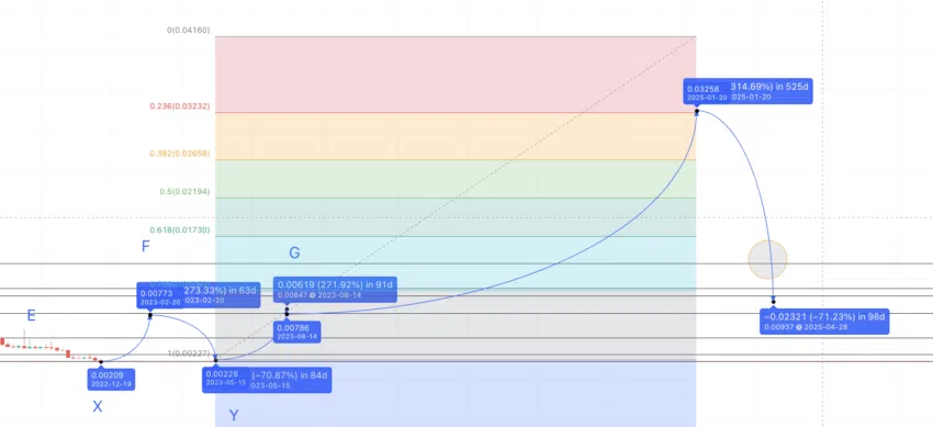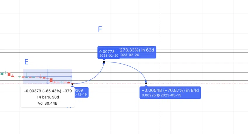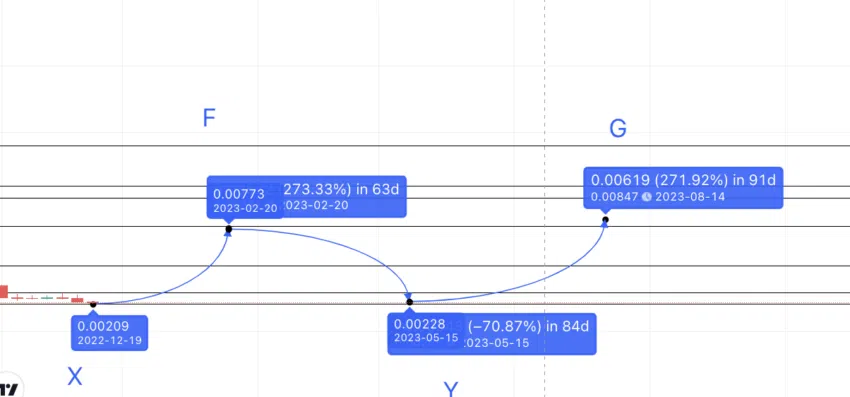 ดังนั้น จุดสูงสุดถัดไปอาจจะเพิ่มขึ้น 273% จากจุด Y ไปอยู่ที่ 0.00847 ดอลลาร์ แม้ว่ามันอาจจะเกิดขึ้นในปี 2023 แต่ตลาด Crypto ที่เป็นขาลงในปัจจุบันอาจจะผลักดันจุดสูงสุดนั้นให้ไปเกิดช่วงต้นปี 2024 ได้