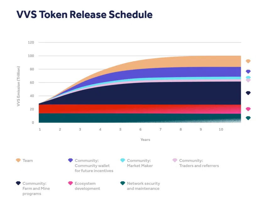 VVS Finance มีรูปแบบ “การปล่อย” โทเค็นแบบคงที่ อุปทานเริ่มต้นอยู่ที่ 50 ล้านล้าน และนับจากนี้เป็นต้นไปครึ่งหนึ่งของจำนวนคงที่ของโทเค็นของปีที่แล้วจะเพิ่มขึ้น ดังนั้น ความขาดแคลนอาจจะเกิดขึ้นเมื่อการออกโทเค็นลดลง ปัจจุบัน 100 ล้านล้านเป็นขีดจำกัดของอุปทาน และมีเพียง 31% ของโทเค็นเท่านั้นที่อยู่ในการหมุนเวียน