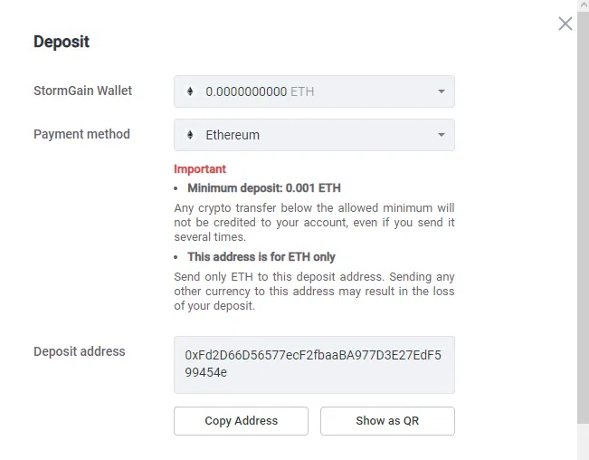 3. จากที่นี่ เลือกที่อยู่สำหรับฝากที่แสดงด้านล่างและใส่มันลงในกระเป๋าเงินที่คุณส่ง รอให้การทำธุรกรรมเสร็จสมบูรณ์ และควรปรากฏในกระเป๋าเงิน StormGain ของคุณ