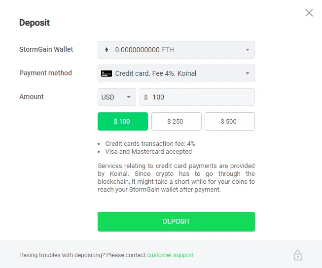 1. เมื่อคุณสมัครบัญชีเว็บเทรดแล้ว คุณต้องเข้าสู่ระบบและใส่วิธีการชำระเงิน เว็บเทรดส่วนใหญ่จะรองรับบัตรเดบิต/เครดิตของคุณหรือการเชื่อมต่อบัญชีธนาคาร ไม่ว่าคุณจะชอบแบบไหน ใส่ข้อมูลลงไปใน StormGain โดยคลิก “Deposit” ที่ด้านบนขวา