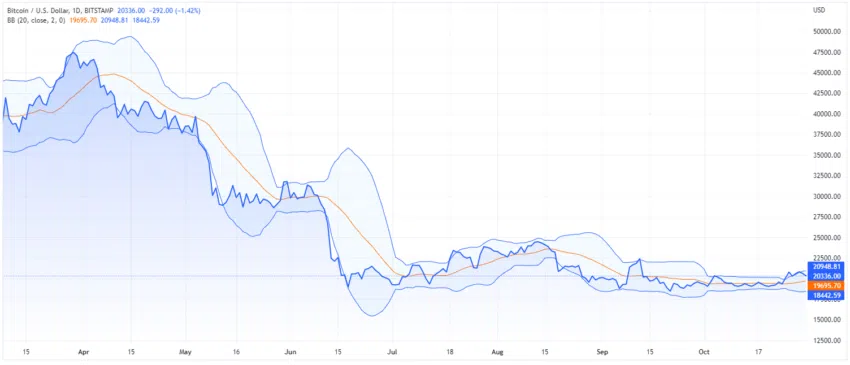 Bollinger Bands เป็นตัวชี้วัดความเคลื่อนไหวทางสถิติที่ใช้ส่วนเบี่ยงเบนมาตรฐานเพื่อกำหนดจุดสูงสุด/ต่ำสุดที่ BTC ได้แตะในช่วงเวลาที่กำหนด เมื่อ Bollinger Bands บนและล่างบีบตัว คุณอาจจะคาดการณ์ได้ว่าความเคลื่อนไหวของราคาจะพุ่งขึ้นในระยะสั้นๆ โดยไม่คำนึงถึงทิศทาง