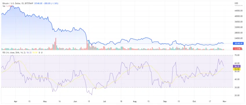 Relative Strength Index หรือ RSI เป็นตัวชี้วัดความเคลื่อนไหวแบบมาตรฐานที่จะช่วยให้คุณวัดแนวโน้มของการกลับตัวของ BTC หรือสินทรัพย์ Crypto อื่นๆ ได้ หากราคา BTC ทำระดับสูงขึ้นเรื่อยๆ ในขณะที่ RSI ทำจุดสูงสุดที่ต่ำกว่า คุณอาจจะคาดการณ์ได้ว่าราคาของมันจะลดลง RSI Indicator ยังช่วยระบุพื้นที่ที่มีการซื้อมากเกินไปและการขายมากเกินไปในสินทรัพย์ Crypto อีกด้วย