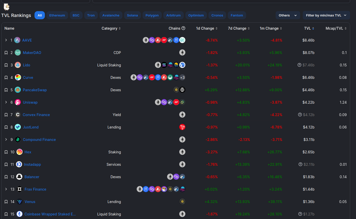 เริ่มต้นด้วยการตรวจสอบรายชื่อ dapps ที่ใหญ่ที่สุดในระบบนิเวศของ crypto ในแง่ของ TVL สังเกตว่า 90% ของโครงการชั้นนำอยู่บน Ethereum