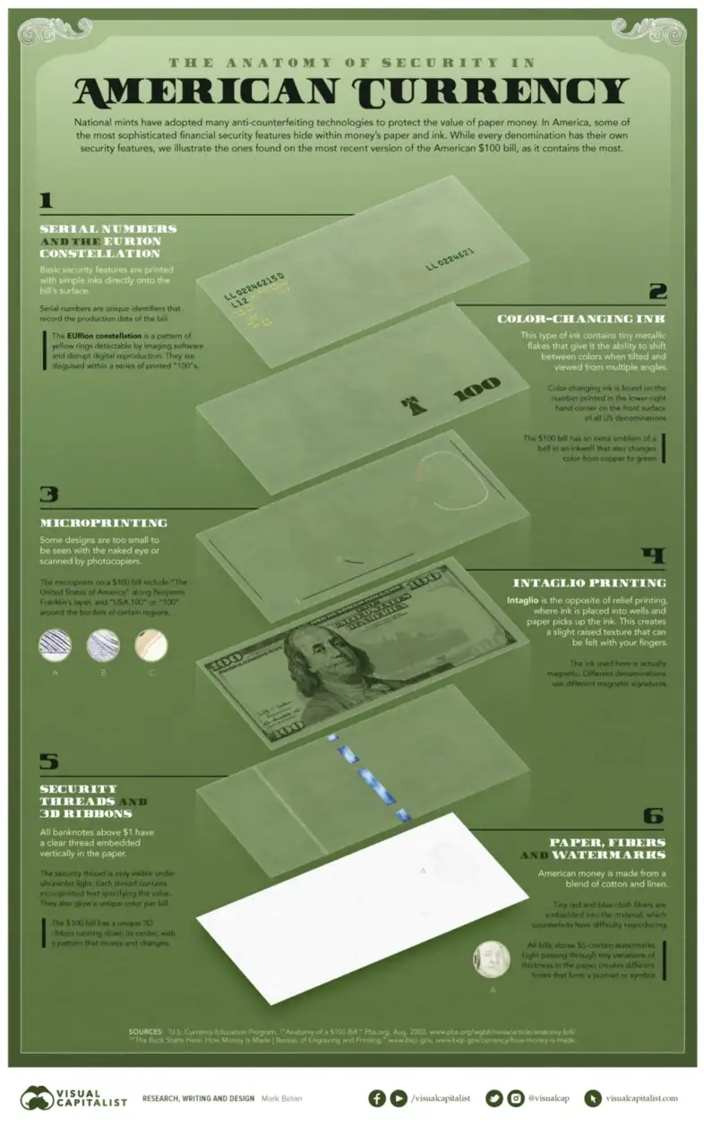 ในปี ค.ศ. 1739 เบนจามิน แฟรงคลินพยายามจัดการกับปัญหาเงินปลอมในอเมริกา โดยใช้แท่นพิมพ์และใบไม้เพื่อสร้างลวดลายที่นูนขึ้นมาบนธนบัตรในยุคอาณานิคม เกือบ 300 ปีต่อมา เบนจามิน แฟรงคลินคือใบหน้าของธนบัตรมูลค่า 100 ดอลลาร์สหรัฐฯ และได้รับการปกป้องด้วยคุณสมบัติด้านความปลอดภัยมากมาย รวมถึงภาพลับเฉพาะ หมึกพิเศษ ลายน้ำที่ซ่อนอยู่ ลายเซ็นแม่เหล็ก และอื่นๆ ในภาพนี้ (รูปที่ 11) พวกเขาได้แยกบิล $100 เพื่อแสดงกายวิภาคของสกุลเงินอเมริกัน