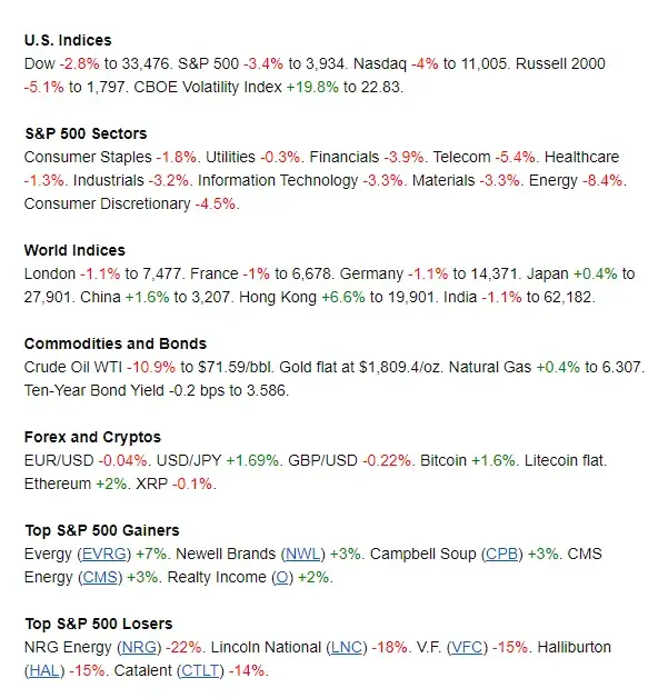 ดาวโจนส์ร่วง 2.8%, S&P 500 ร่วงลง 3.4% และ Nasdaq ร่วงลง 4% ความกลัวต่อการปรับขึ้นอัตราดอกเบี้ยของธนาคารกลางสหรัฐและภาวะเศรษฐกิจถดถอยที่ตามมาเพิ่มขึ้นเนื่องจากนักลงทุนถอนเงินออกไป การเพิ่มขึ้นของราคาขายส่งที่มากกว่าที่คาดไว้ไม่ได้ช่วยในกรณีของภาวะกระทิงเช่นกัน