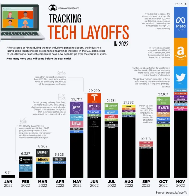 การปลดพนักงานเกิดขึ้นบ่อยครั้งในปี 2022 จนทุกคนตั้งแต่ Crunchbase ไปจนถึง Inc42 เว็บไซต์เทคโนโลยีของอินเดียกำลังตามไปติดๆ มีแม้แต่เว็บไซต์แบบสแตนด์อโลนที่ติดตามการเลิกจ้างเทคโนโลยีทั้งหมดในสหรัฐอเมริกา สำหรับจุดประสงค์ของอินโฟกราฟิกนี้ (รูปที่ 6) พวกเขาใช้ข้อมูลจาก trueup.io ซึ่งรวมถึงบริษัทเทคโนโลยีของสหรัฐฯ และนานาชาติที่ปล่อยพนักงานไปในปี 2022