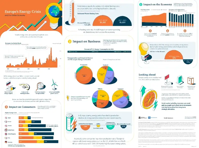 ราคาพลังงานที่ผันผวนกำลังกดดันต้นทุนครัวเรือนและผลผลิตทางธุรกิจในยุโรป ในขณะที่ราคาพลังงานลดลงในช่วงหลายเดือนที่ผ่านมา มีหลายปัจจัยที่อาจส่งผลต่อความผันผวนของราคาในอนาคต เช่น รัสเซียลดการจัดหาพลังงาน ความต้องการเครื่องทำความร้อนในฤดูหนาวที่เพิ่มขึ้น และโรงเก็บสินค้าในยุโรปที่หดตัว ในอินโฟกราฟิกด้านล่างจาก New York Life Investments (รูปที่ 9) เราแสดงให้เห็นผลกระทบที่อาจเกิดขึ้นจากวิกฤตพลังงานของยุโรปต่อผู้บริโภค ธุรกิจ และเศรษฐกิจโลกในวงกว้าง