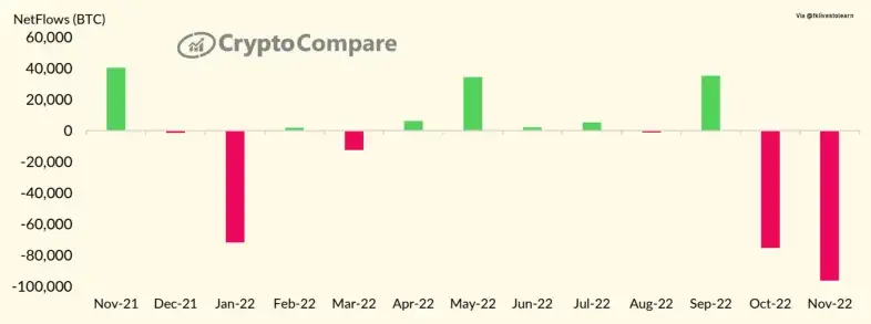 หลังจากการล่มสลายของ FTX เมื่อวันที่ 8 พฤศจิกายน การแลกเปลี่ยนแบบรวมศูนย์ได้เห็นการไหลออกจำนวนมากเนื่องจากนักลงทุนตื่นตระหนกเกี่ยวกับความปลอดภัยของเงินฝากบนแพลตฟอร์มแบบรวมศูนย์ ในเดือนพฤศจิกายน BTC บันทึกกระแสเชิงลบที่ใหญ่ที่สุดจาก CEXs ในประวัติศาสตร์ โดยมีการไหลออกสุทธิที่ -91,557 BTC (รูปที่ 8) มีแนวโน้มว่าเราจะเห็นความต่อเนื่องของแนวโน้มนี้เนื่องจากการเล่าเรื่อง ‘Not your keys, not your coins’ เข้าครอบงำตลาด crypto